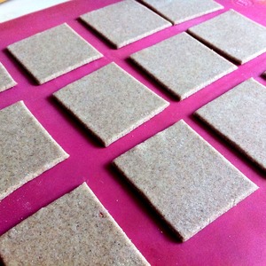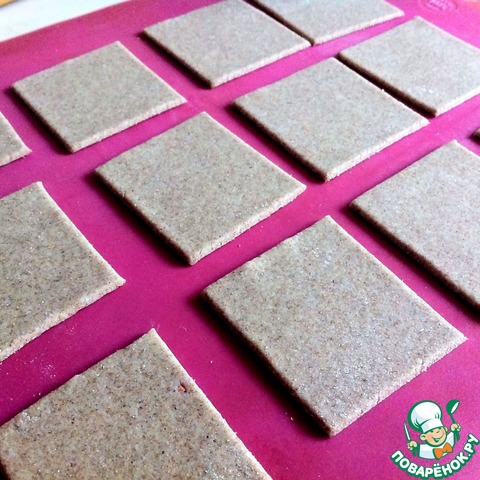 Тесто раскатать тонко и нарезать на квадраты со стороной примерно 5 см.
