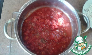 Выливаем томаты в емкость для тушения, добавляем соль, базилик, перемешиваем и разогреваем.