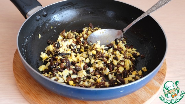На сковороду добавить 70 гр. сливочного масла, выложить грибы и яичную крошку.