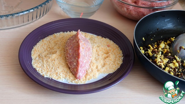 Полученный из фарша пирожок запанировать в панировочных сухарях. -