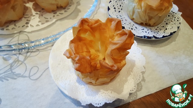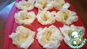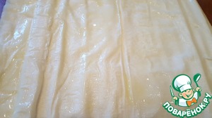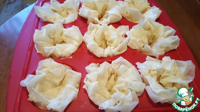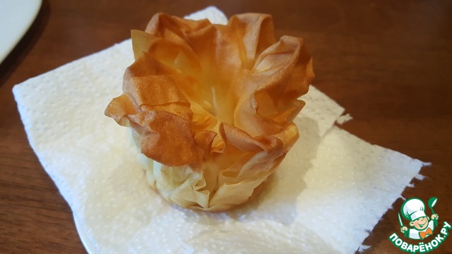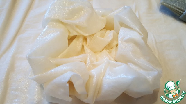 Смазать маслом формы. Затем, смазываем маслом лист теста фило. -