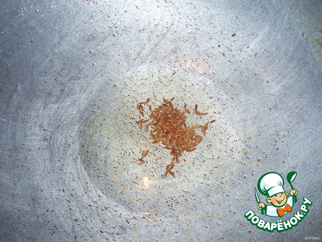 В посуду с толстым дном налить масло, нагреть его и в горячее положить зёрна кумина.