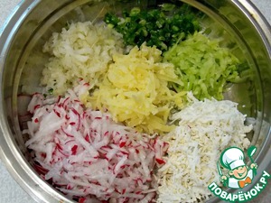 Все овощи, картошку и яйцо натереть на крупной терке.