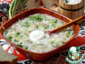 Разложить по тарелкам, залить белым квасом"Очаково", положить сметану и подавать.