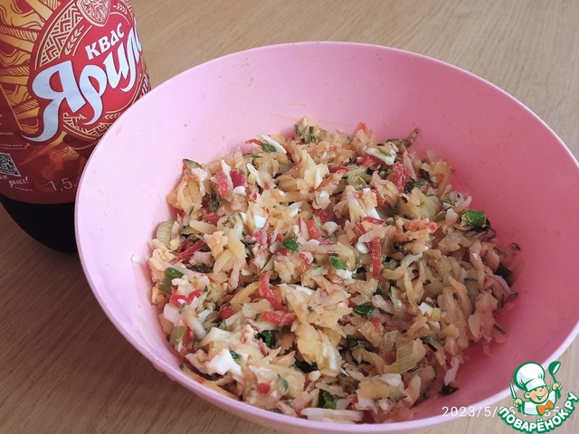 Название такое от того, что всё кроме лука натирается на крупной терке. От этого вкус окрошки становится более насыщенный. А традиционный белый квас от фирмы "Очаково" "Семейный секрет" отлично их дополняет.