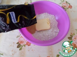 Добавляем щепотку соли, разрыхлитель теста и сливочное масло.