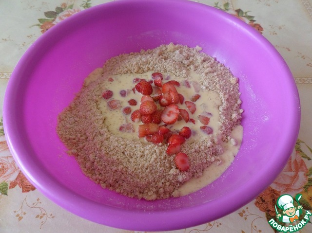 В чашку с тестом - крошкой добавляем сливочно-яичную смесь и нарезанные ягоды.