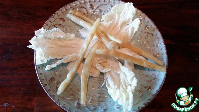 На тарелку выложить листья салата и фасоль /я использовала маринованную по рецепту www.povarenok.ru/rec ipes/show/ 54313/.