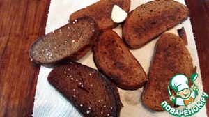 Кусочки черного хлеба посолить и обжарить в растительном масле на большом огне, с двух сторон натереть зубчиком чеснока и посыпать рубленным укропом. Кстати, эти сухарики в нас в Латвии являются любимой закуской к пиву.