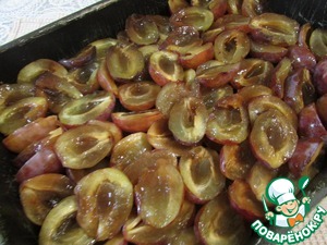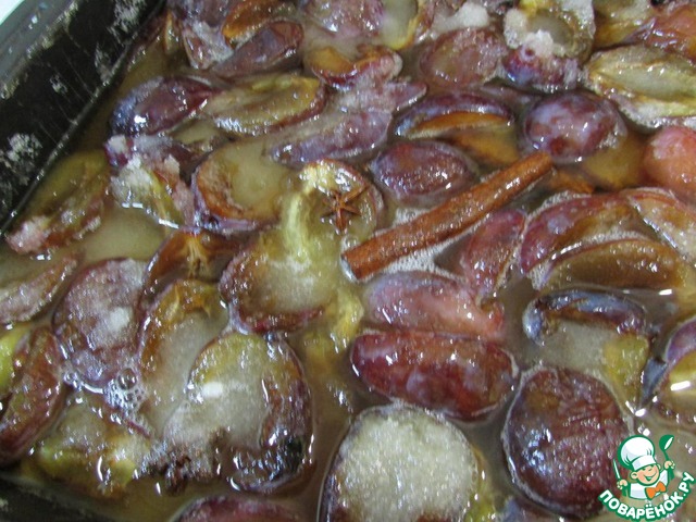 По истечение времени поставить форму с половинками слив в разогретую духовку (150 градусов). Запекать джем 2 часа, изредка помешивая. Может понадобиться больше времени, все зависит от сливы. Томить фрукты пока не загустеет сироп. Палочки корицы и бадьян вынуть из готового джема.