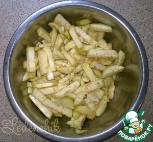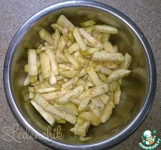 Баклажаны очистить, нарезать брусочками, посолить и оставить на 10-20 мин.
