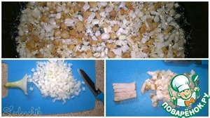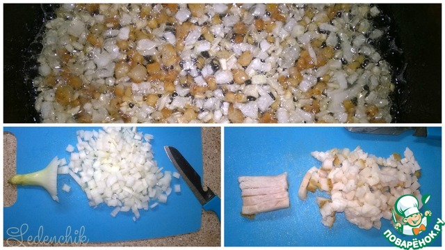 Сало и лук нарезать мелким кубиком, обжарить на сковородке до кремовго цвета лука