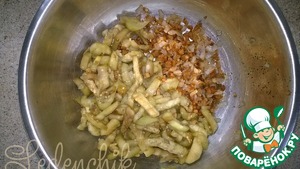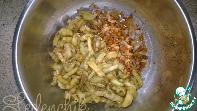 Баклажаны сполоснуть водой, хорошенько отжать и слегка обжарить на растительном масле, смешать с луком и салом