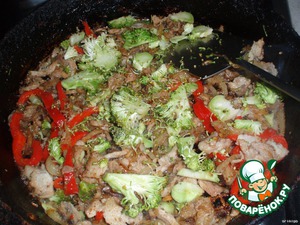 Отправила в компанию к мясу с луком. Не забываем перемешивать. Огонь сделала слабым. Приступаем к овощам-перцы, синие приводим в порядок, режем соломкой и в сковороду.