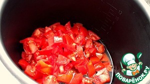 В чашу мультиварки налить растительное масло, положить кубики помидор.