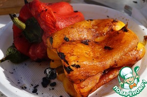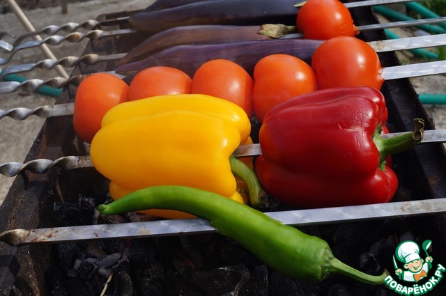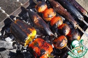 Как только шампуры освобождаются от шашлыка - на них нанизываются все наши овощи, включая острый перец.