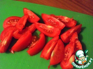 Помидоры разрезать пополам, каждую половинку на 4 части. Мельчить не нужно. Прелесть этого салата заключается в крупной нарезке продуктов.