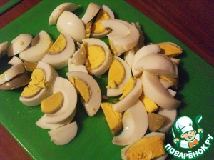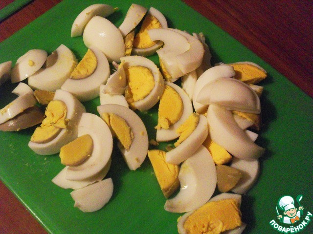 Яйца очистить, нарезать пополам, а потом дольками толщиной чуть меньше сантиметра.