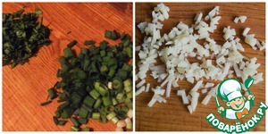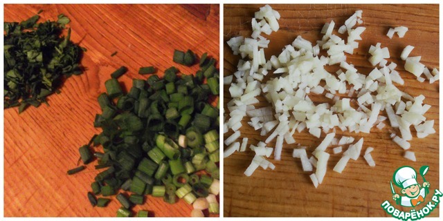 Лук зеленый мелко нарезать, петрушку так же.
