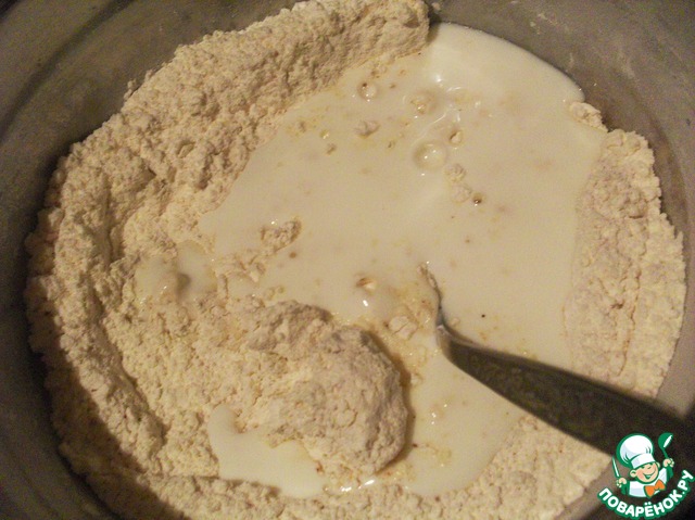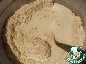• Добавляем соду и лимонку, перемешиваем смесь еще раз. Добавляем кефир. Замешиваем на кефире до густоты манной каши. Чем больше будет кефира, тем мягче будет хлеб и вязкость его будет выше.
