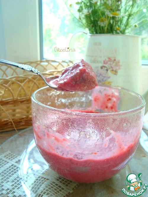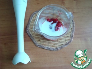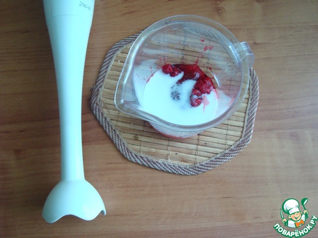 • Разбиваем малину, йогурт и сахар блендером.