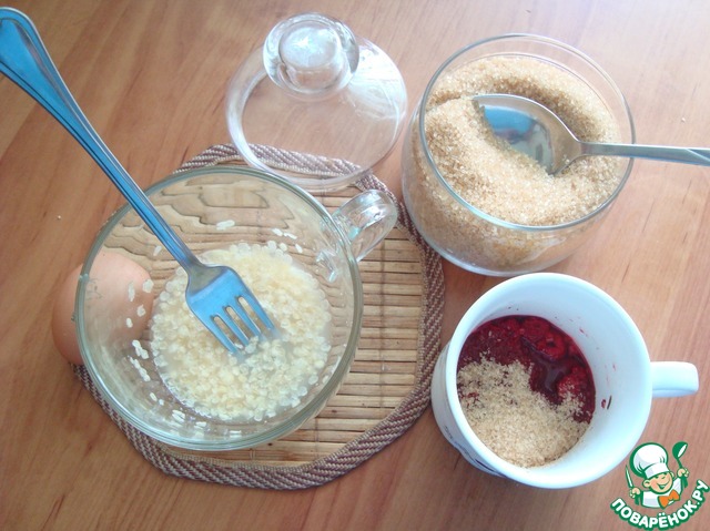 • Поочерёдно все продукты соединяем вилкой: яйцо-масло-сахар-мука.