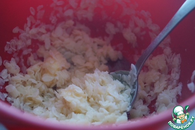 Один из её ингредиентов - рисовые хлопья от ТД "Мистраль", они немного грубоваты, поэтому сначала нужно их немного смягчить.