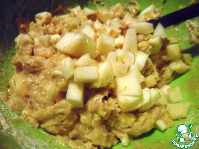 Яблоки вымыть, обсушить, очистить от кожуры и семян, порезать кубиками со стороной 1 см и вмешать в тесто.
