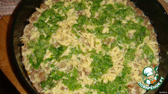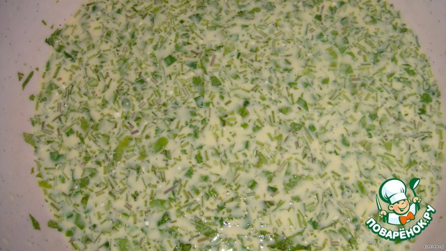 Зелень измельчаем и перемешиваем со сливками и яйцами.