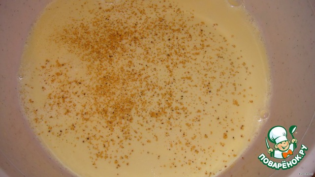Сливки и яйца перемешиваем, добавляем соль перец.