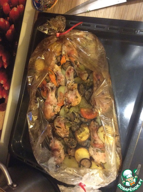 8. В рукав для запекания аккуратно выложить картошку, вторым слоем овощи, сверху положить курицу, посыпать зеленью оставшейся в тарелке вылить оставшийся маринад в рукав. Сделать 3-2 маленьких надреза сверху рукава ( рукав может взорваться если их не будет).
