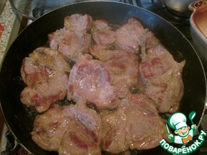 Выкладываем мясо кусками на сковороду с разогретым маслом и обжариваем до приятного золотисто-коричневого цвета. Запах просто божественный!
