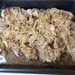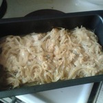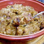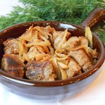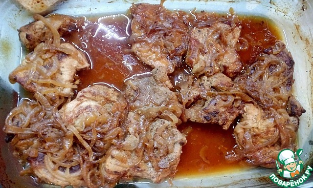 Мясо выкладываем в емкость для запекания. Если есть глиняная посуда, то это просто идеальный вариант. Сверху на мясные кусочки выкладываем обжаренный лук и равномерно распределяем по поверхности. Оставшийся на сковородке соус тоже выливайте на мясо, так будет еще сочнее.