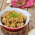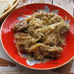 Лук обжариваем в той же сковороде, что и мясо, пусть пропитается вкусным соусом и хорошенько подрумянится. -