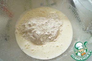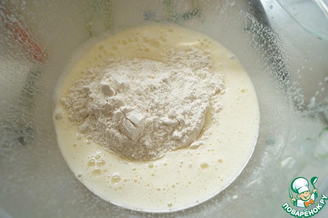 • Муку смешать с солью, разрыхлителем и содой, добавить в яично-масляную смесь, перемешать.