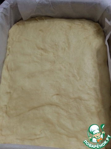 По прошествии времени, руками распределить тесто по противню (размер 20х32 см), выстеленному пекарской бумагой. -