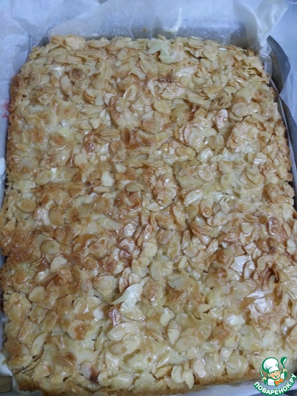 Намазать теплую (не горячую) массу на тесто и поставить выпекаться на 30 минут до зарумянивания миндального слоя. -