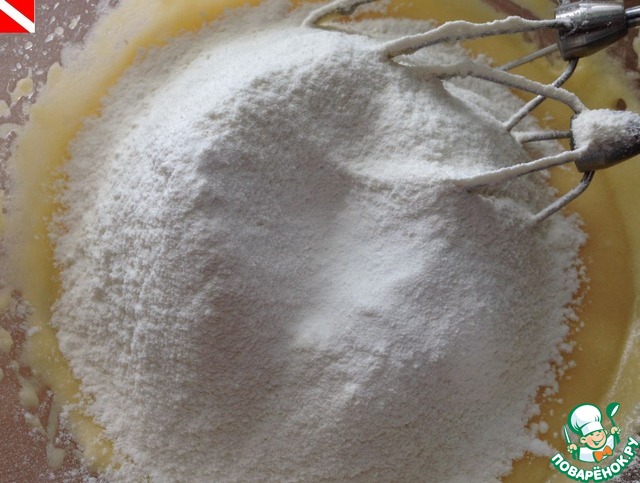 Муку просеять с разрыхлителем, перемешать до однородной массы.