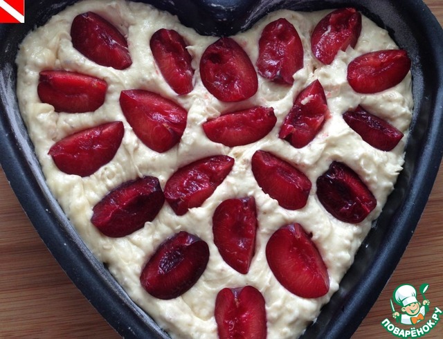 Тесто переложить в форму, сверху слегка вдавить сливы.