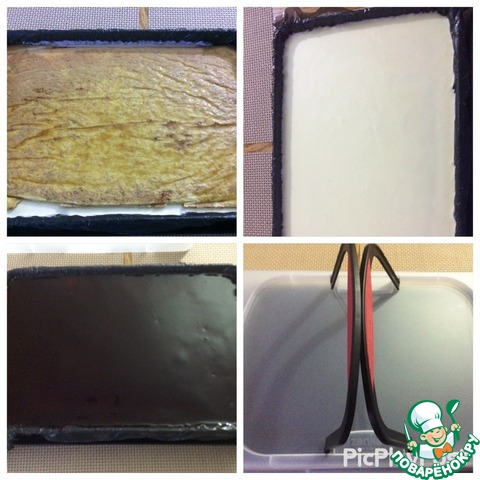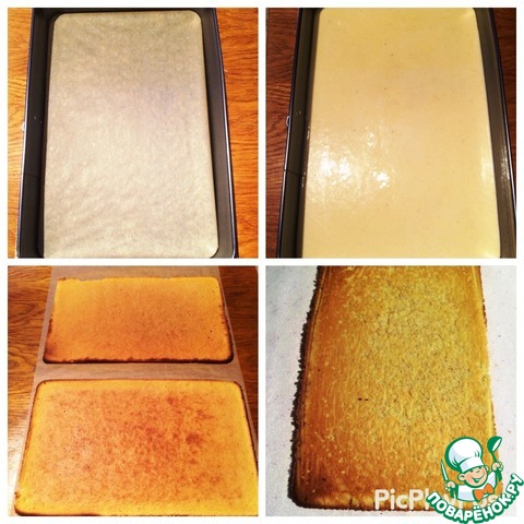В форму (примерно 24Х24, у меня 45Х25), застеленную пекарской бумагой, выкладываем 1/2 часть теста, выпекаем корж в разогретой духовке до 180 градусов минут 15-20 (следим за своей духовкой, они все разные).