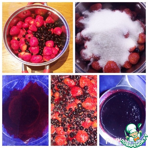 Клубнику и смородину моем, чистим, складываем в кастрюльку с толстым дном. Наливаем воду, добавляем сахар и ставим варится. По мере закипания, снимаем образующуюся пенку. Немного увариваем ягодную смесь, минут 10.