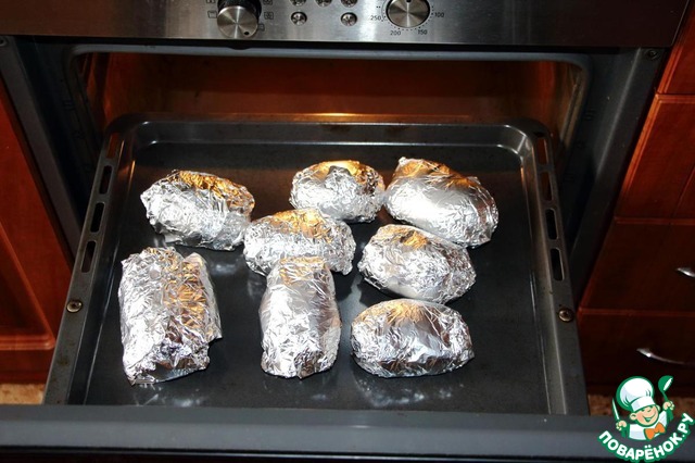 И отправить в духовку запекаться первый раз. Температура примерно 200 градусов, минут сорок. Готовность можно проверить потыкав зубочисткой в картошину. Если свободно протыкается, значит готово.