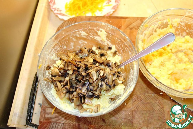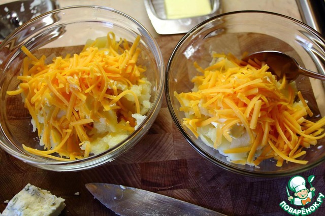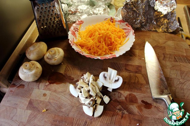 Пока духовка трудится над прошедшей кастинг картошкой, можно натереть сыр Чеддер и нарезать довольно мелко грибы.