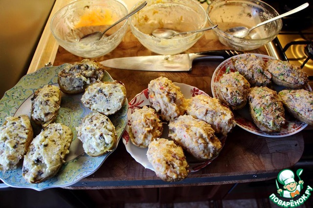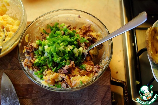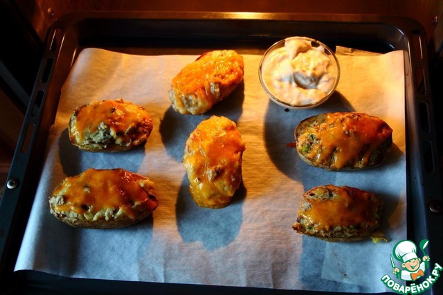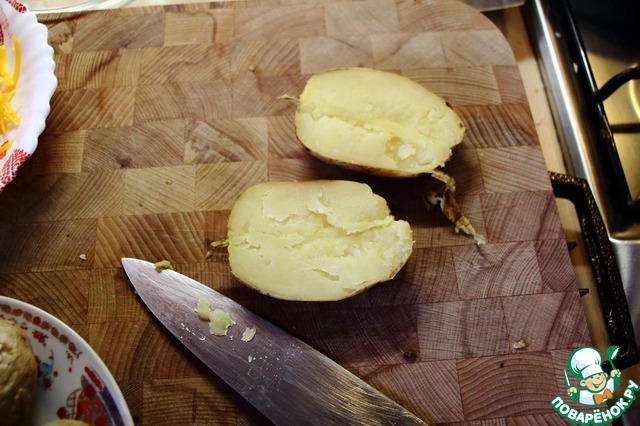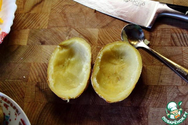 Чайной ложкой надо вынуть из картошки её нутро))) Получаются такие лодочки. Посмотрите, толщина стенки на фото оптимальная. Лодочка хорошо держит форму и имеется много места для начинки.