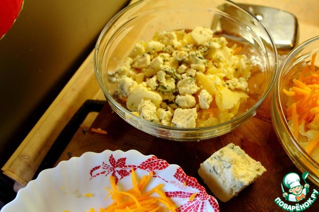 В среднюю и правую миску добавляю Чеддер. Немного сыра надо оставить на потом, на посыпку.