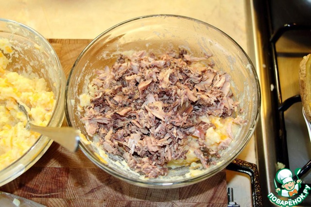 Так уж случилось, что у меня почему-то не оказалось фотокарточки того что я делал со средней мисочкой. А там я как раз делал свой вариант начинки. Жаль, но я постараюсь описать словами, благо это совсем просто. Я использовал остатки тушеной свинины в соусе Бешамель. Пару дней назад я ее сделал, мы поели, и вот, осталось не то не сё. На 3 полноценные порции не хватает, да и поднадоело уже всем... Ещё один плюс данного рецепта - возможность таким вот образом "утилизировать" какие-либо свои остатки. Помните знаменитую фразу из фильма "Вокзал для двоих" Это не объедки - это остатки, это большая разница! Вот я и взял тушеную свинину и замикшировал ее в миске с картошкой и сыром. Кусочки мяса не большие, всё получилось в лучшем виде. -