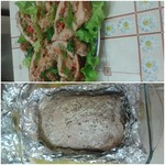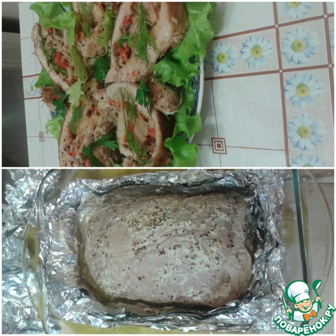 На внутреннюю сторону мяса выкладываем чеснок и перец сладкий, нарезанный кубиками, сворачиваем рулетом. Рулет хорошо заматываем в фольгу и ставим в духовку на средний огонь томиться около 1,5-2-х часов, после срезать верхний слой фольги и дать подрумяниться рулету.