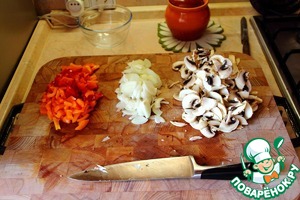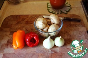 Сначала подготовим то, что нам надо пожарить. Это лук, грибы и болгарский перец.