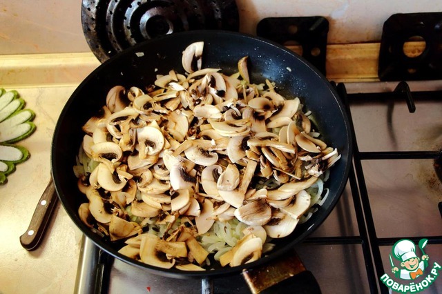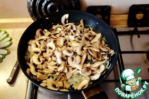 Чуть стал лук помягче, грибы на него. Стоит грибы немного подержать сверху на луке, сразу не перемешивать, так они отдадут меньше влаги и останутся сочными.