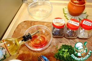 Пока сковородка готовится можно приготовить заправку для салата. Это немного уксуса. Винного, яблочного, только не простого 9%. Также немного масла оливкового или простого растительного. Зелень нарубить меленько, а вышеозначенные перчики размолоть в ступке. Всё смешать в мисочке до однородной эмульсии.